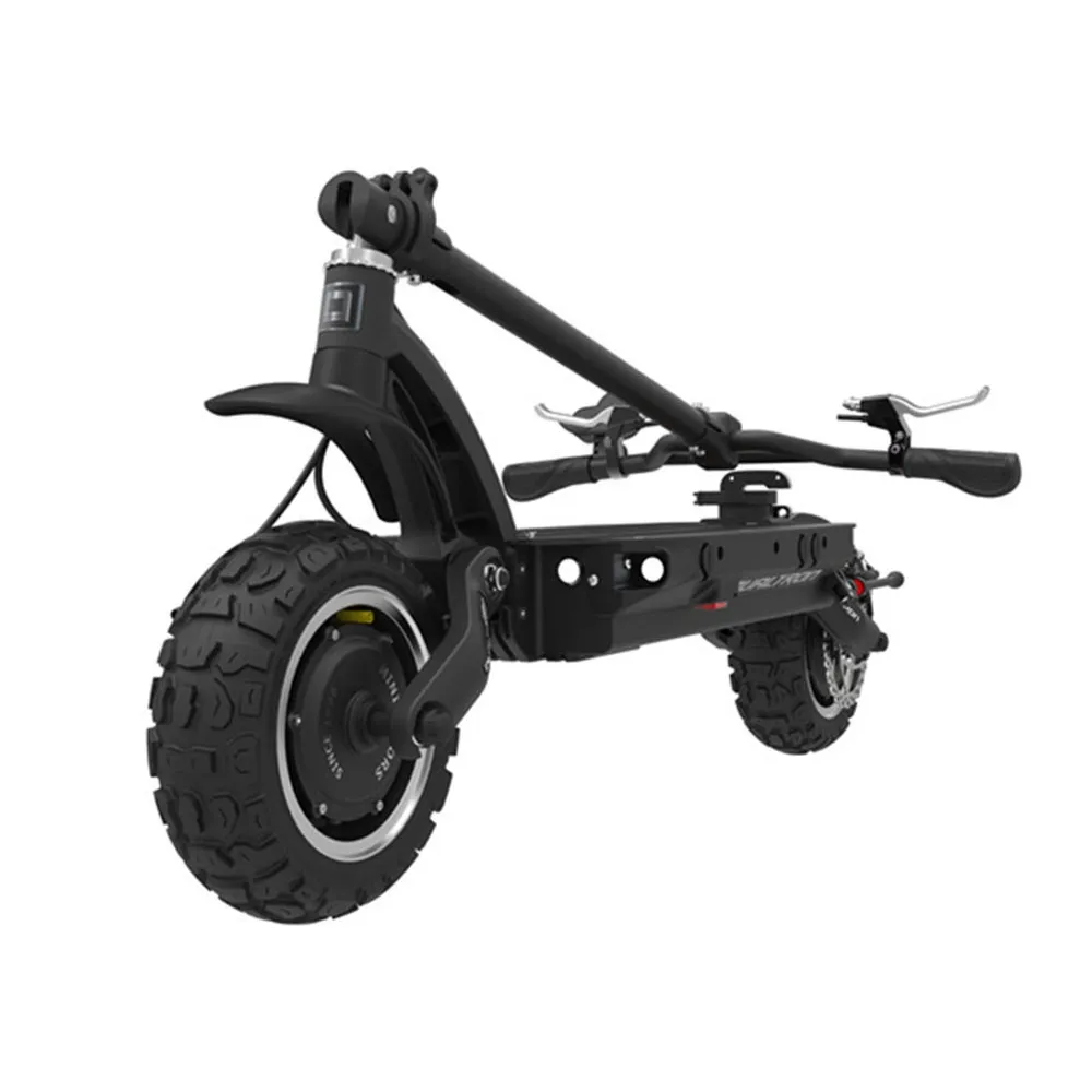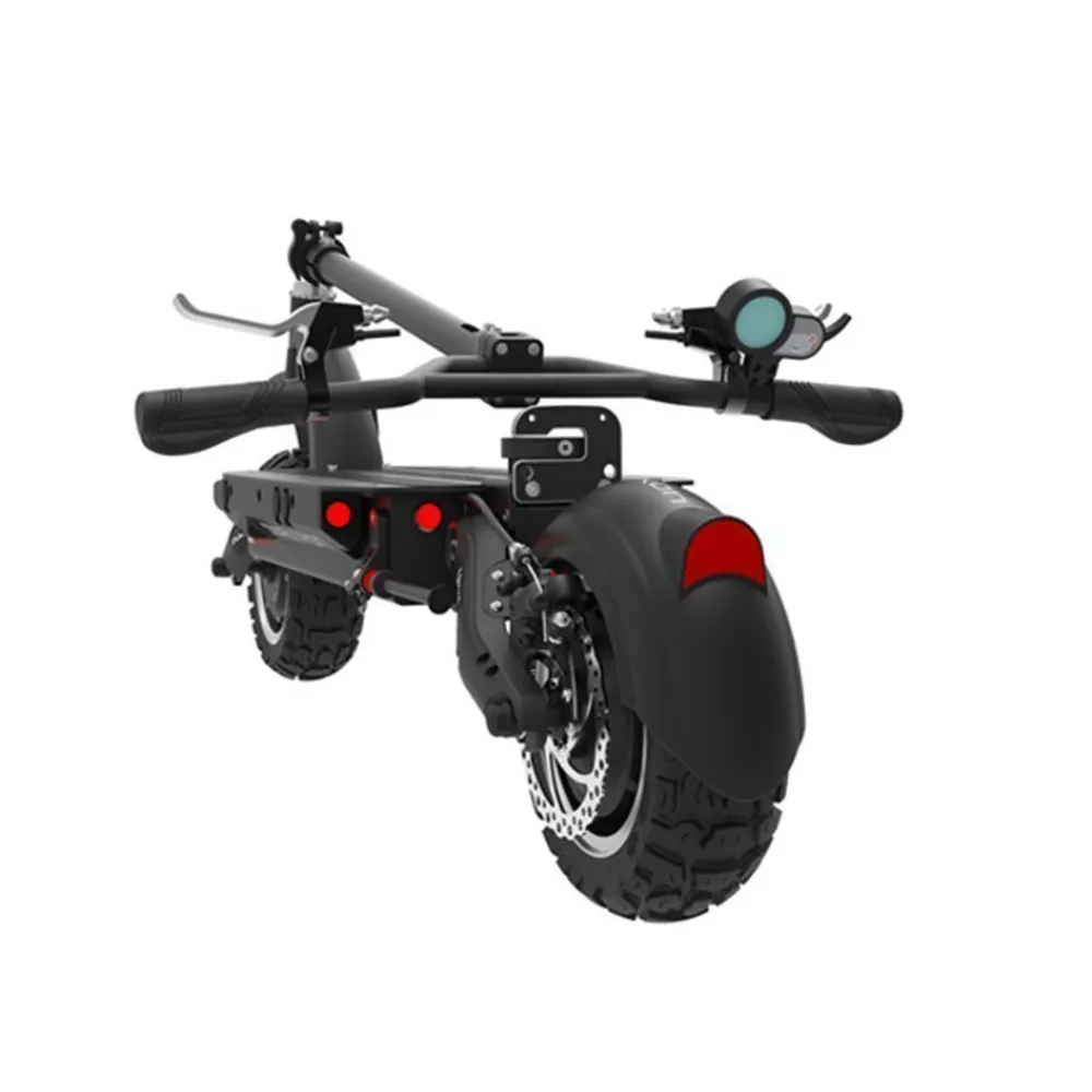Электросамокат имеет два мотор-колеса, мощность каждого по 2700 Вт. Максимальная скорость 85 км/ч, ее можно сравнить со скоростью автомобиля. При желании спокойного передвижения и в целях экономии заряда, можно легко отключить один мотор. Рама выполнена из высокопрочного и легкого алюминия. Складывается, нет проблем с местом для хранения.