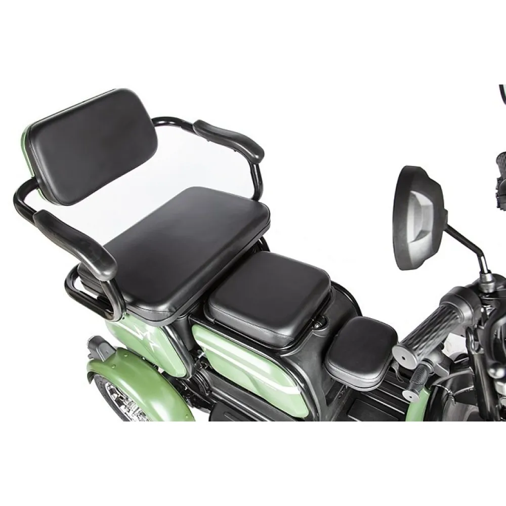 Практичная техника с мощностью 500 Вт без труда развивает скорость до 25 км/час и преодолевает 30 км пути. Мягкое объемное сиденье повторяет анатомические части тела, не вызывает усталости, снижает нагрузку с позвоночника. Дополнительное сиденье удобно для катания детей, поездок в детский сад или с другими целями.