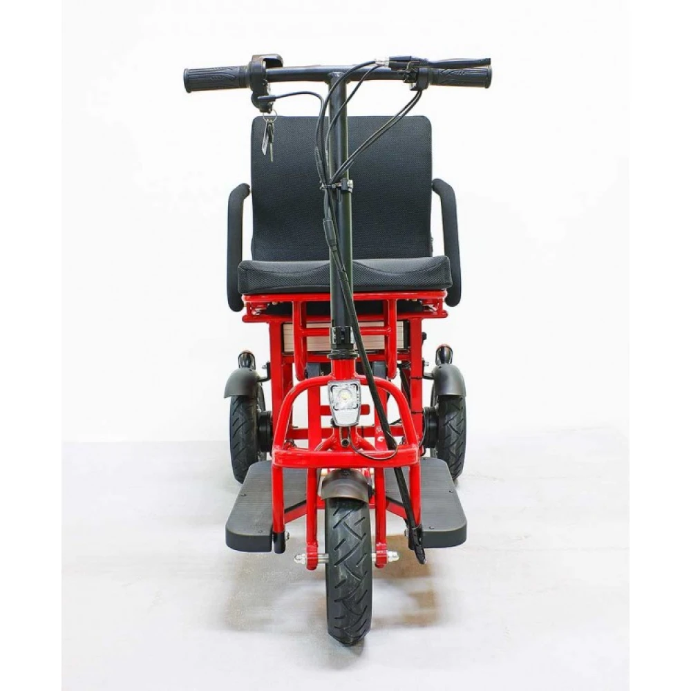 Широкая прорезиненная платформа обеспечивает полноценное размещение стоп, не вызывает усталости ездока. Светодиодная передняя фара допускает движение в вечернее время суток и непогоду. Электротрицикл – современная складная техника, которую сложить можно движением одной руки. В сложенном положении техника напоминает чемодан с ручкой.