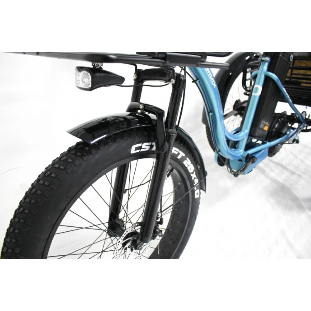 Технические характеристики электровелосипеда позволяют использовать его в пределах городской и сельской местности. Удобные корзины: передняя и задняя предназначены для транспортировки продуктов питания, рюкзака и других полезных для отдыха вещей.