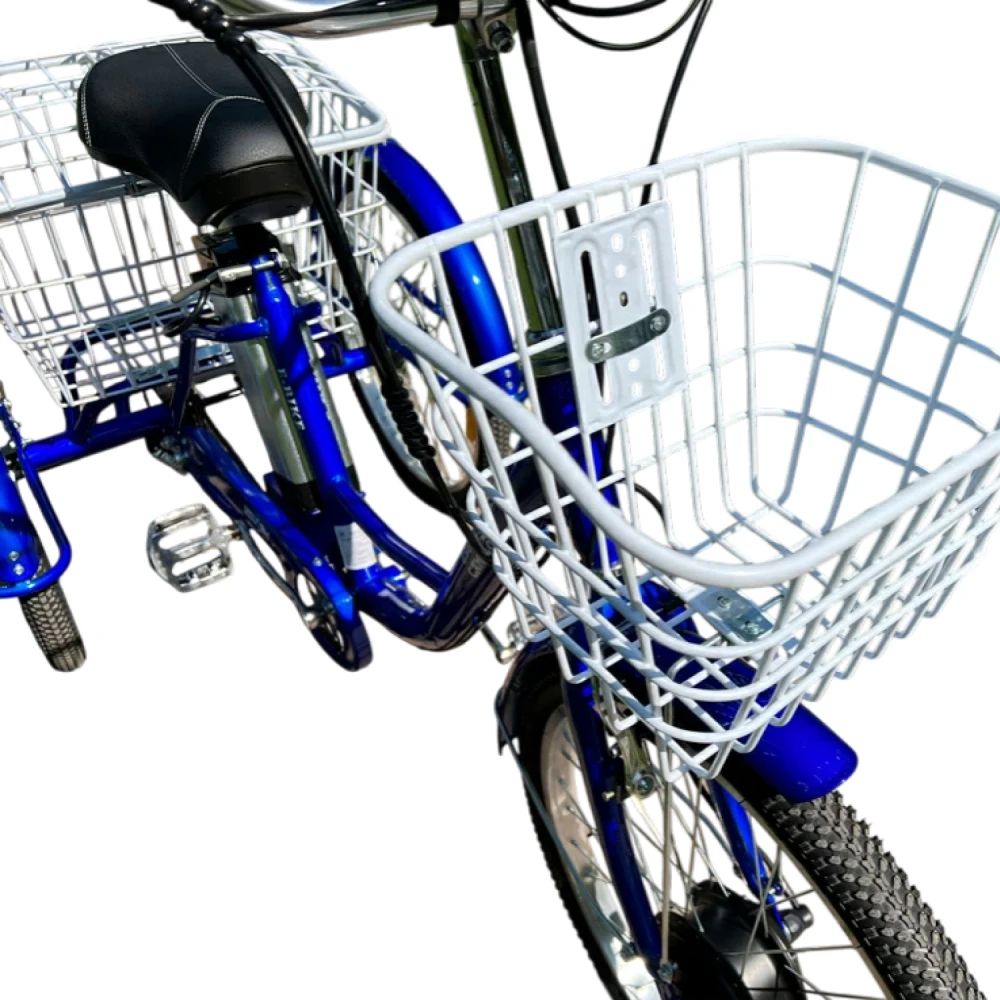 Для 16+, рост 150–185 см, новичков, пожилых, курьеров, людей с ограниченными возможностями (стабильность без баланса). Цели: работа/прогулки/доставка с грузом 50 кг в корзинах. Корзины удобны для дачи/рынка.